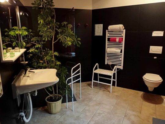 La chambre Renne est adaptée aux personnes à mobilité réduite. Lavabo à hauteur modulable, siège pour la douche et poignée supplémentaire pour la douche.